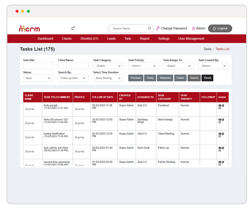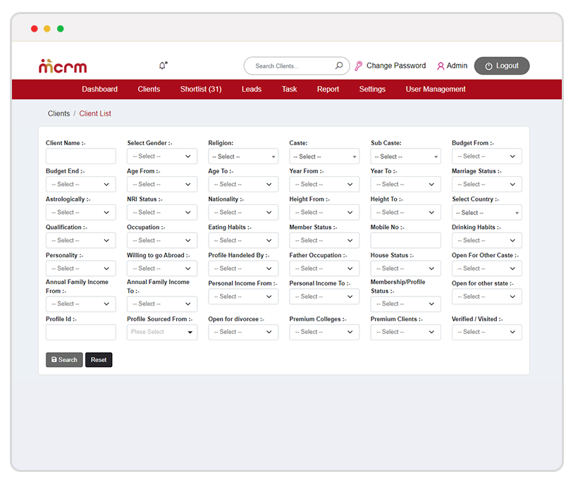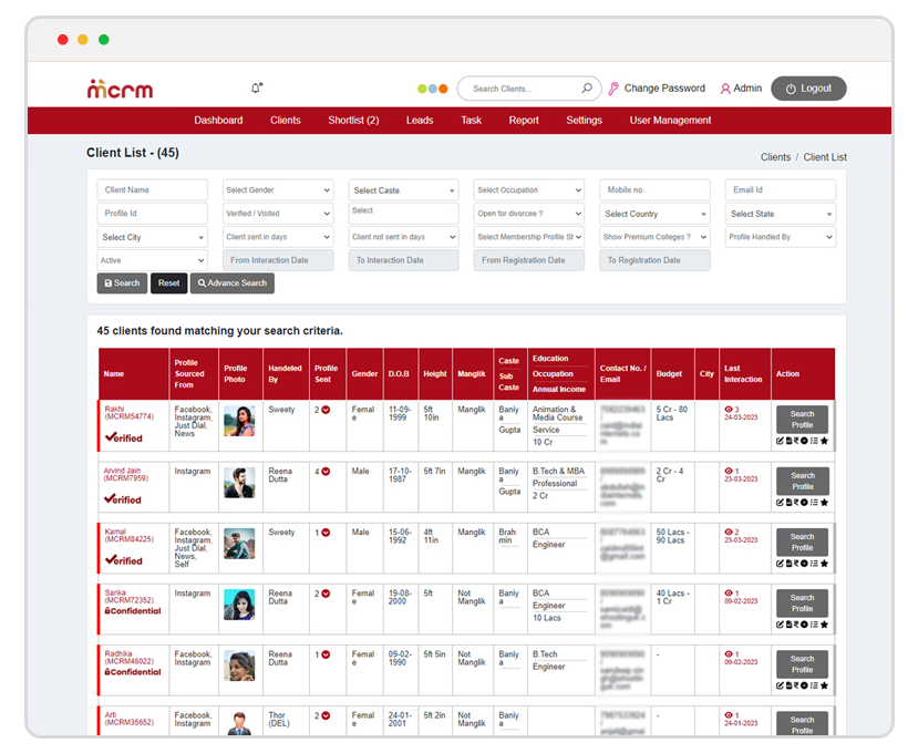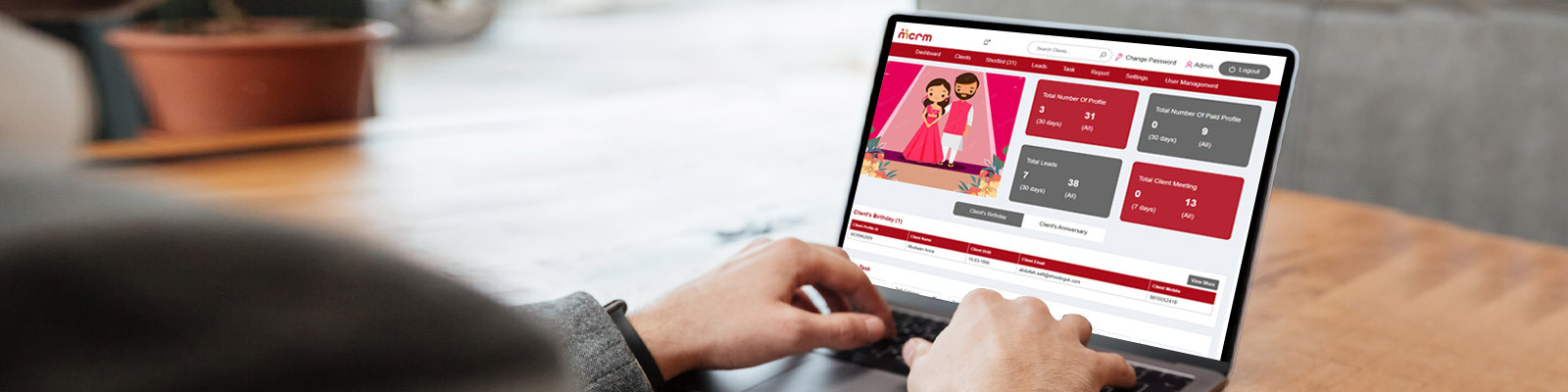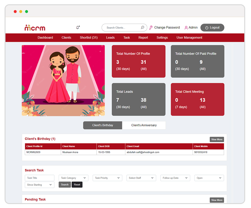 Matrimonial software is a CRM system used to manage the client details, shortlist the suitable matches based on client requirements and send the matches to the client from the Matrimony CRM software. Staff can create tasks and followups with the client. The task becomes visible to them when its due and the staff can take suitable action. Match making software purchase or Matrimony software purchase makes the life easy for marriage bureau, marriage agency or matrimonial management software company who provide personalised Indian matrimonial services.